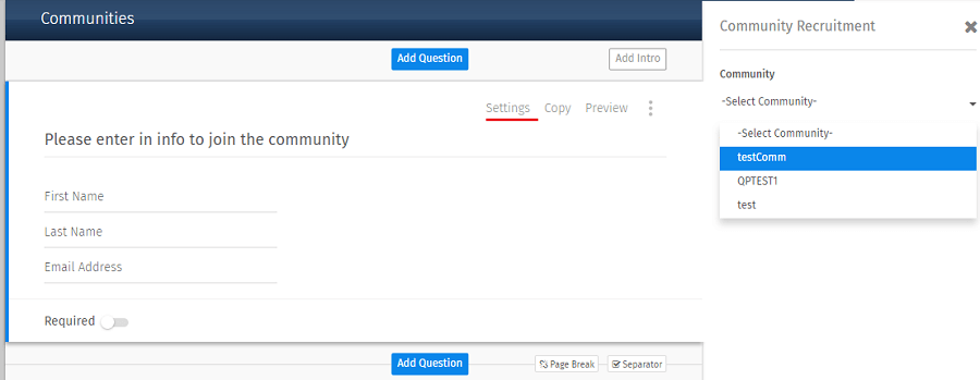 Step 2: Under the “Edit Survey Option” click on the “Add New Question Link”, from community select the recruitment option.